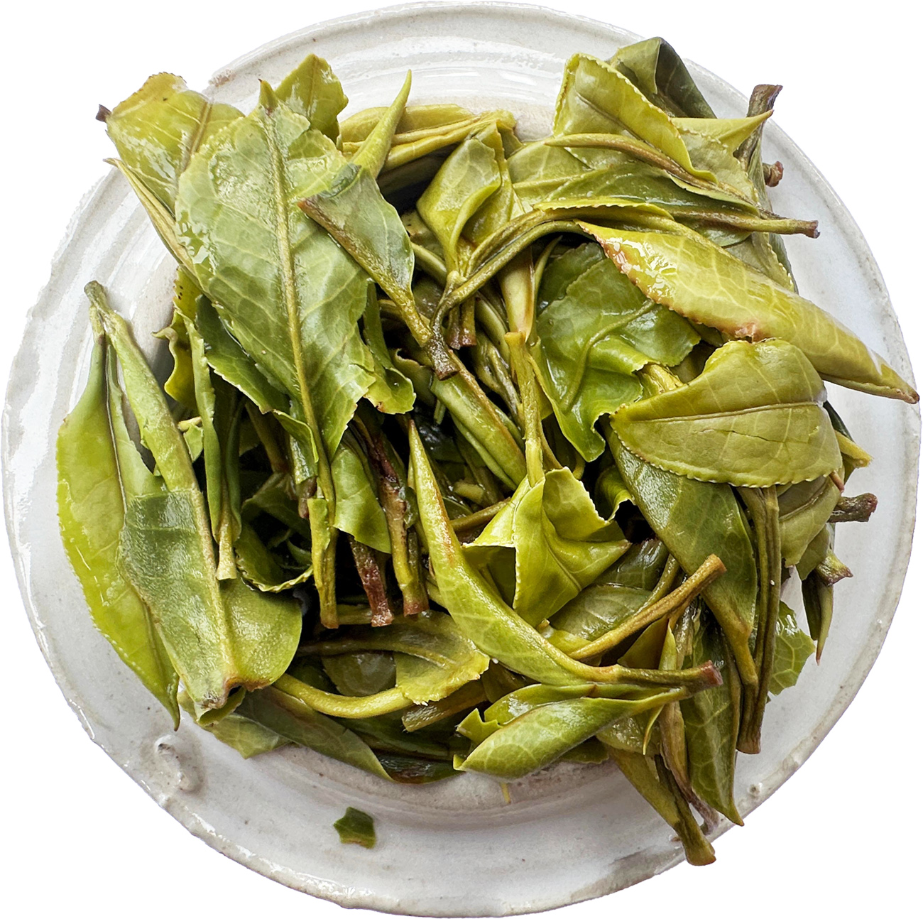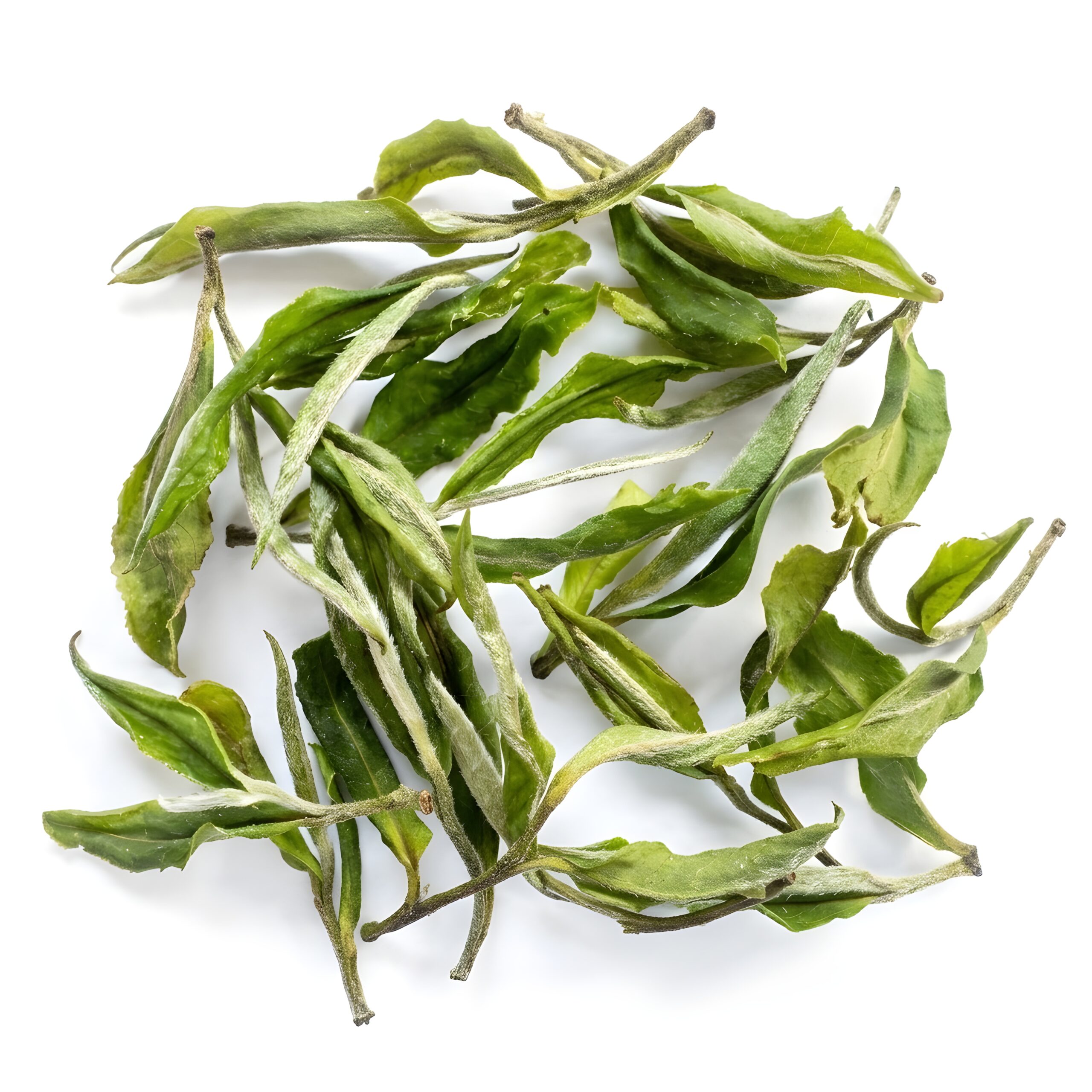Predominantly green in color, the leaves are beautifully accented with long, silvery-white tips that shimmer under light due to the fine, downy hairs covering the buds. This delicate fuzz is a hallmark of premium white tea, representing exceptional freshness, purity and quality. The leaves are notably large yet remarkably light, with a gentle, slightly curled shape that enhances their natural elegance.